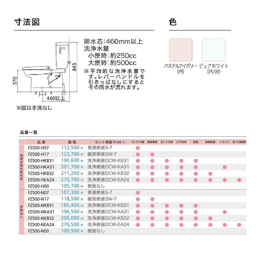 ソフィアシリーズ「FZ500」は、大きくなった日本人の体形に合わせて、便器をエロンゲートサイズ(大型サイズ)としました。ゆったりサイズです。便器、タンクとも陶器製。