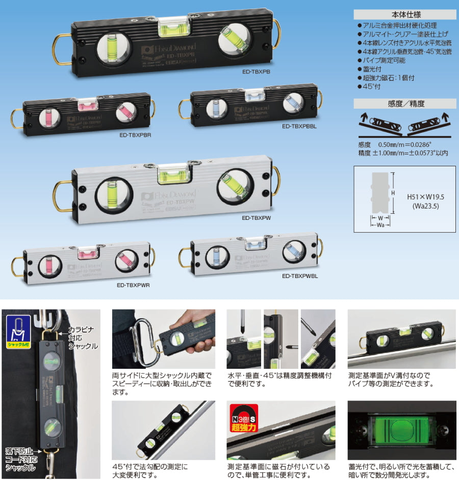 トビシリーズの最上位モデル「トビ・ボックスレベル プロ」。両サイドシャックルや精度調整機構など、プロの現場で求められる機能をフル装備。耐久性・精度・操作性を高次元で両立したハイグレードモデルです。