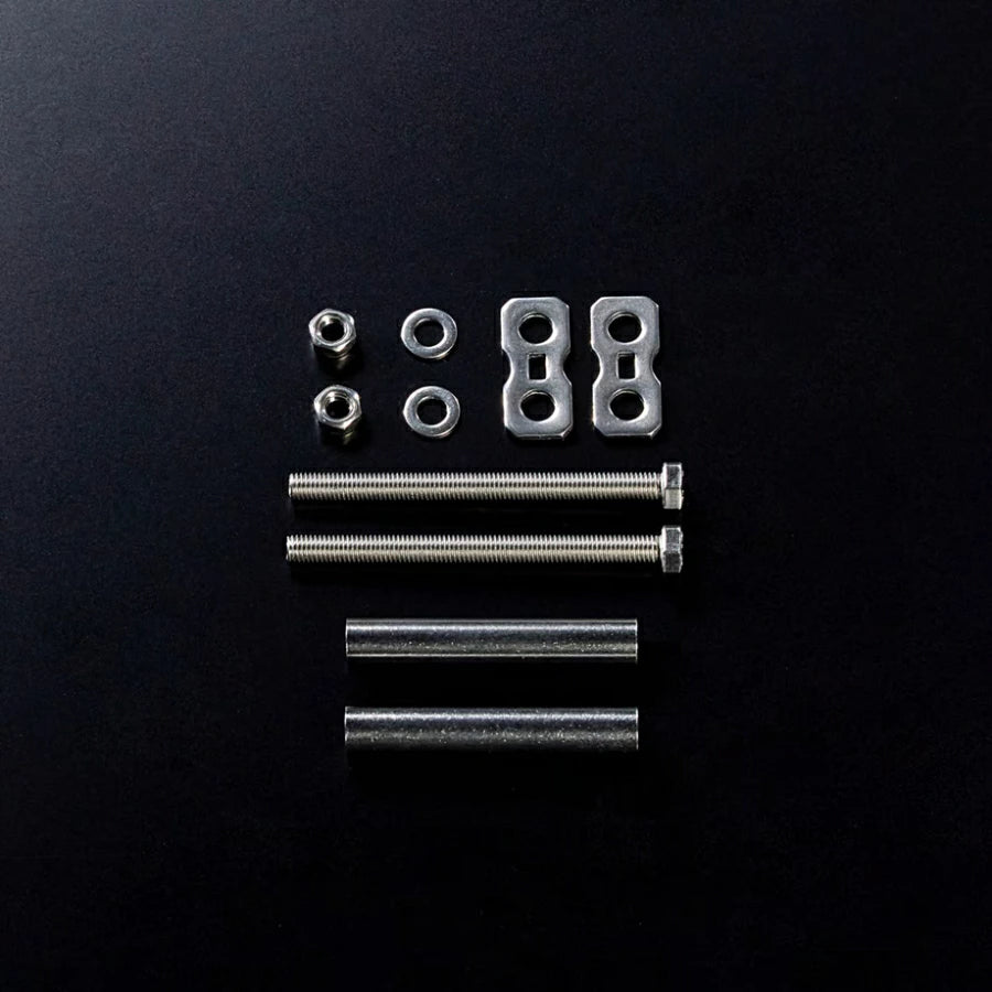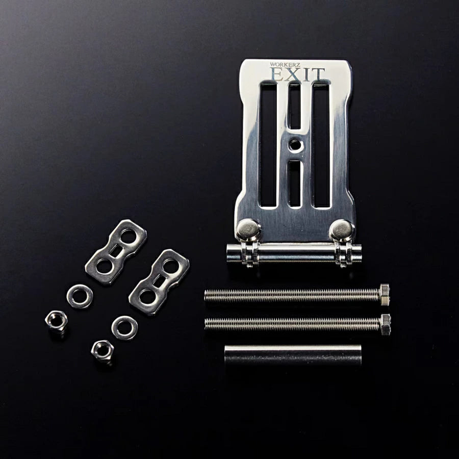 ・プレートチェーンSET (EXT-PLC01)EXIT独自形状のメタルプレート、連結に必要な金具一式が手に入るSET。プレートのベルトループは50mm幅胴ベルトがフィットする専用設計(先端金具幅を想定して53mm)にしており、連結用の金具もホルダー、腰袋と繋げた際のバランスを考慮したコンパクトなサイズ感にしています。