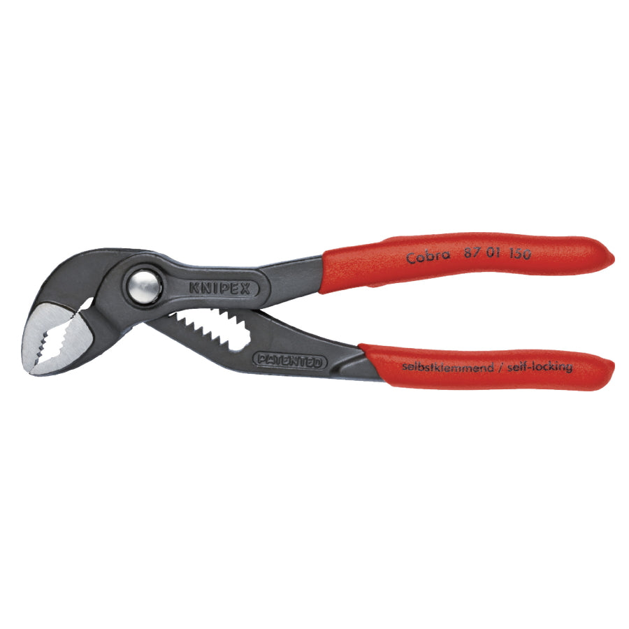 ・KNIPEXの“コブラ”は高性能なウォーターポンププライヤーです。・ジョイント部は横方向へのブレを防止する3枚合わせのボックスジョイント。・プッシュボタンにより、素早く簡単にアゴの幅を細かく調整できます。・アゴの開き調整はプッシュボタンにて行うため、作業中は不意に口幅が変わらないので早く快適に作業ができます。・アゴの開きは片手で調節が可能です。・上のアゴを対象物にあて、プッシュボタンを押しながら、下アゴを上にスライドさせるだけで簡単に調整することができます。・口幅を最大に調節して握っても、ハンドルの間にクリアランスを確保する指詰めストッパー付き。・少ない力でパイプやナットを確実につかむ平行四辺形のアゴ形状。・てこの原理を最大限発揮するデザインで高いグリップ力を発揮します。・入念な焼入れ処理が施されたつかみ面の硬度は約HRC61で、耐磨耗性が高く、確実なグリップを発揮します。・材質はオイル焼き入れ焼き戻し処理済みのクロームバナジウム電気鋼。