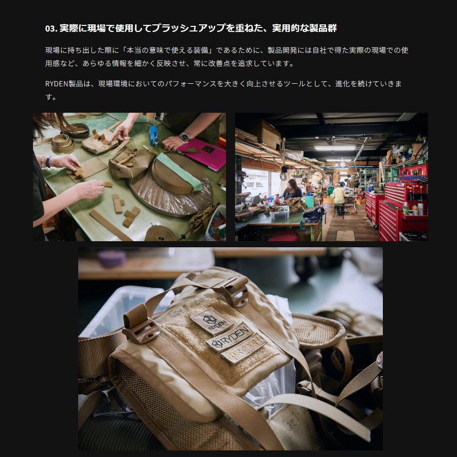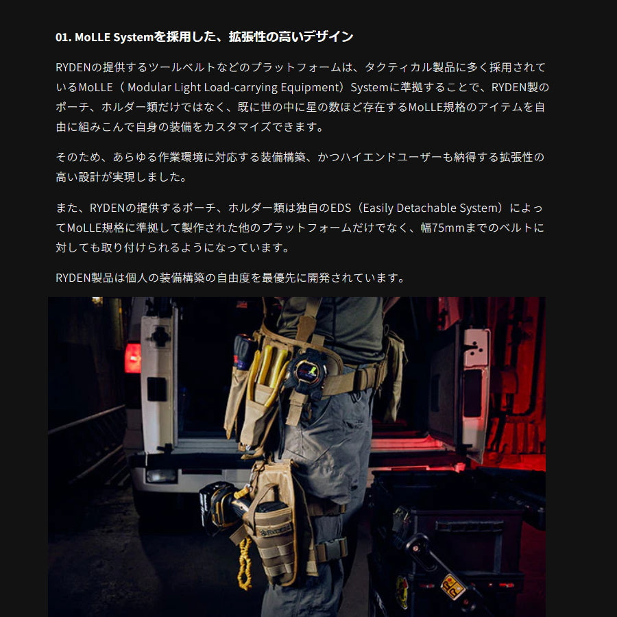 ツールベルトなどのプラットフォームは、タクティカル製品に多く採用されているMoLLE Systemに準拠することで、RYDEN製のポーチ、ホルダー類だけではなく、既に世の中に星の数ほど存在するMoLLE規格のアイテムを自由に組みこんで自身の装備をカスタマイズできます。