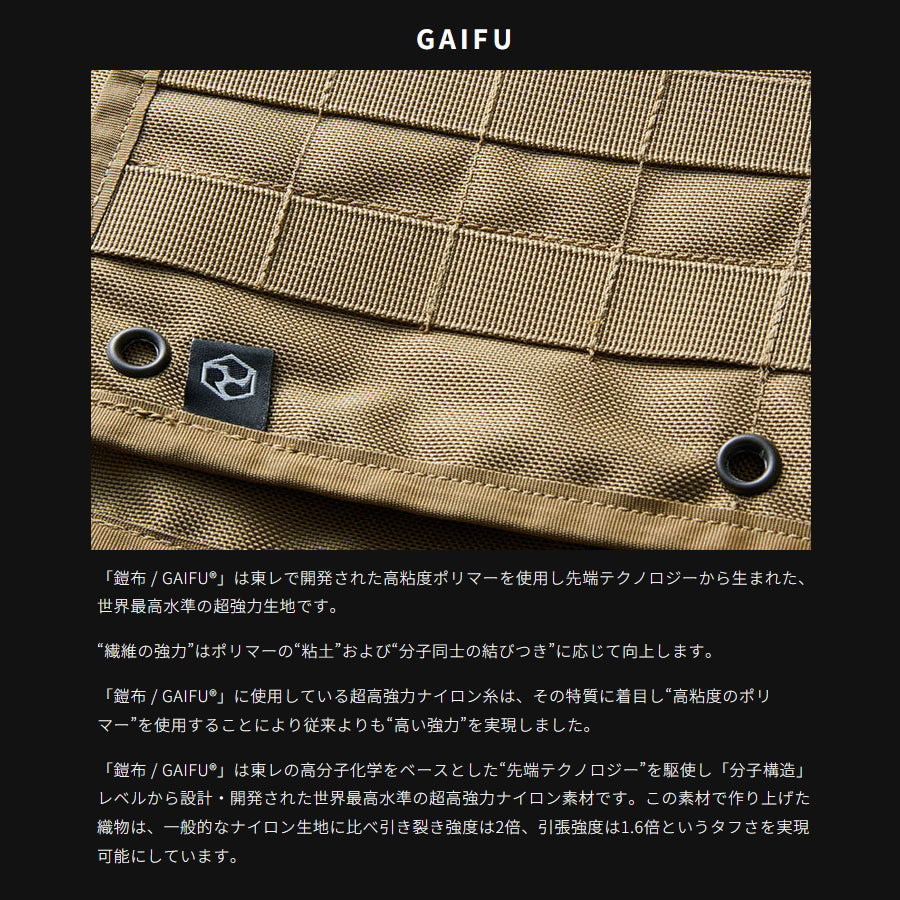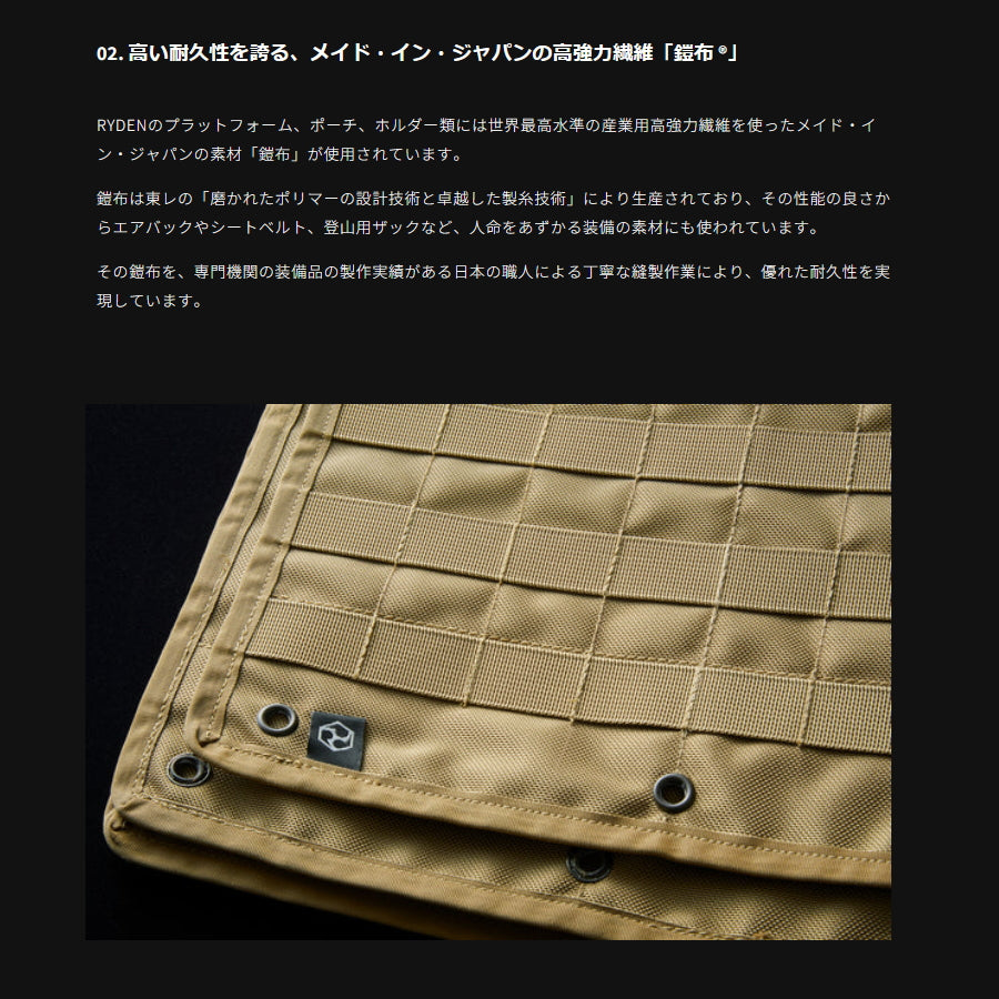 RYDENのプラットフォーム、ポーチ、ホルダー類には世界最高水準の産業用高強力繊維を使ったメイド・イン・ジャパンの素材「鎧布」が使用されています。