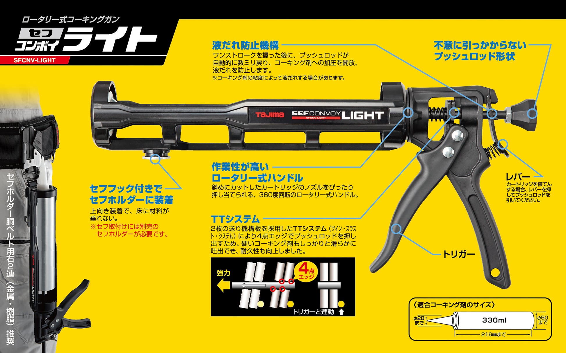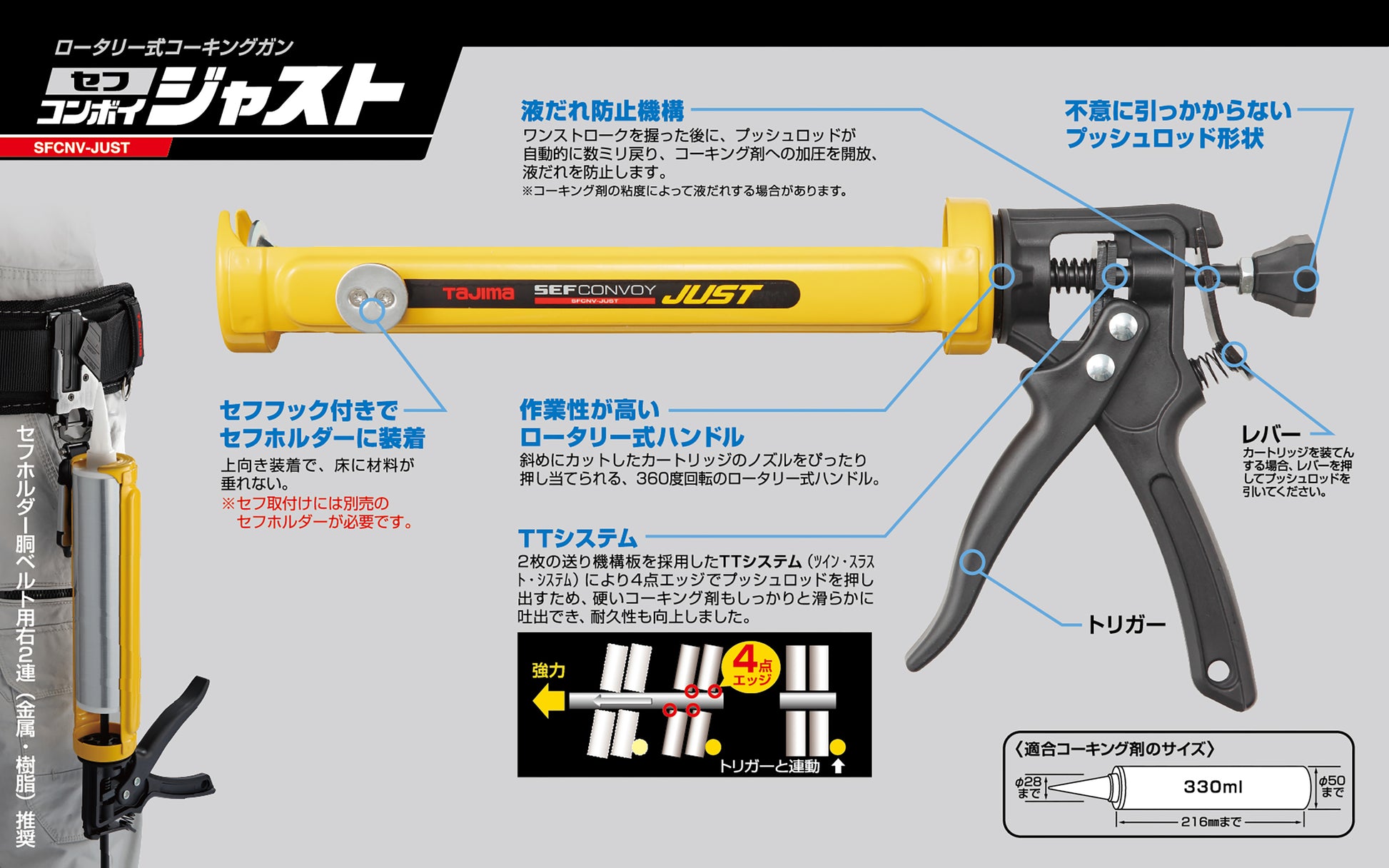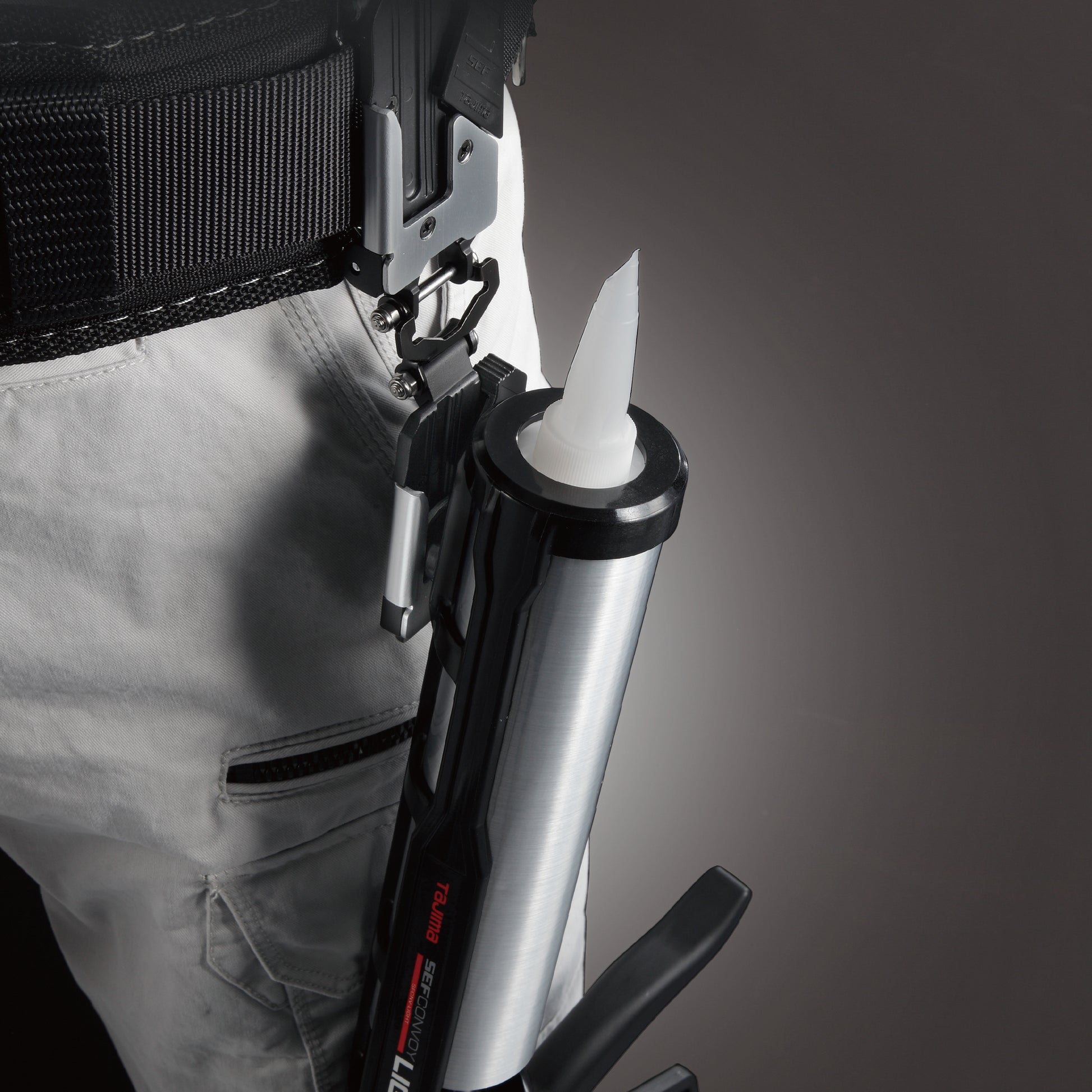 セフホルダーを使って腰周りに装着可能なセフフック付きコーキングガン