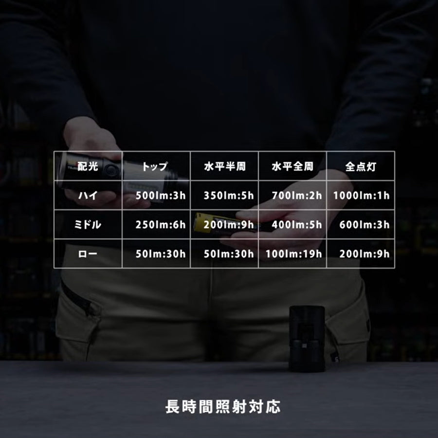 - 大光量1000ルーメン: 天面+水平全周を同時に照らし出し、作業エリア全体の視認性を劇的に向上させます。