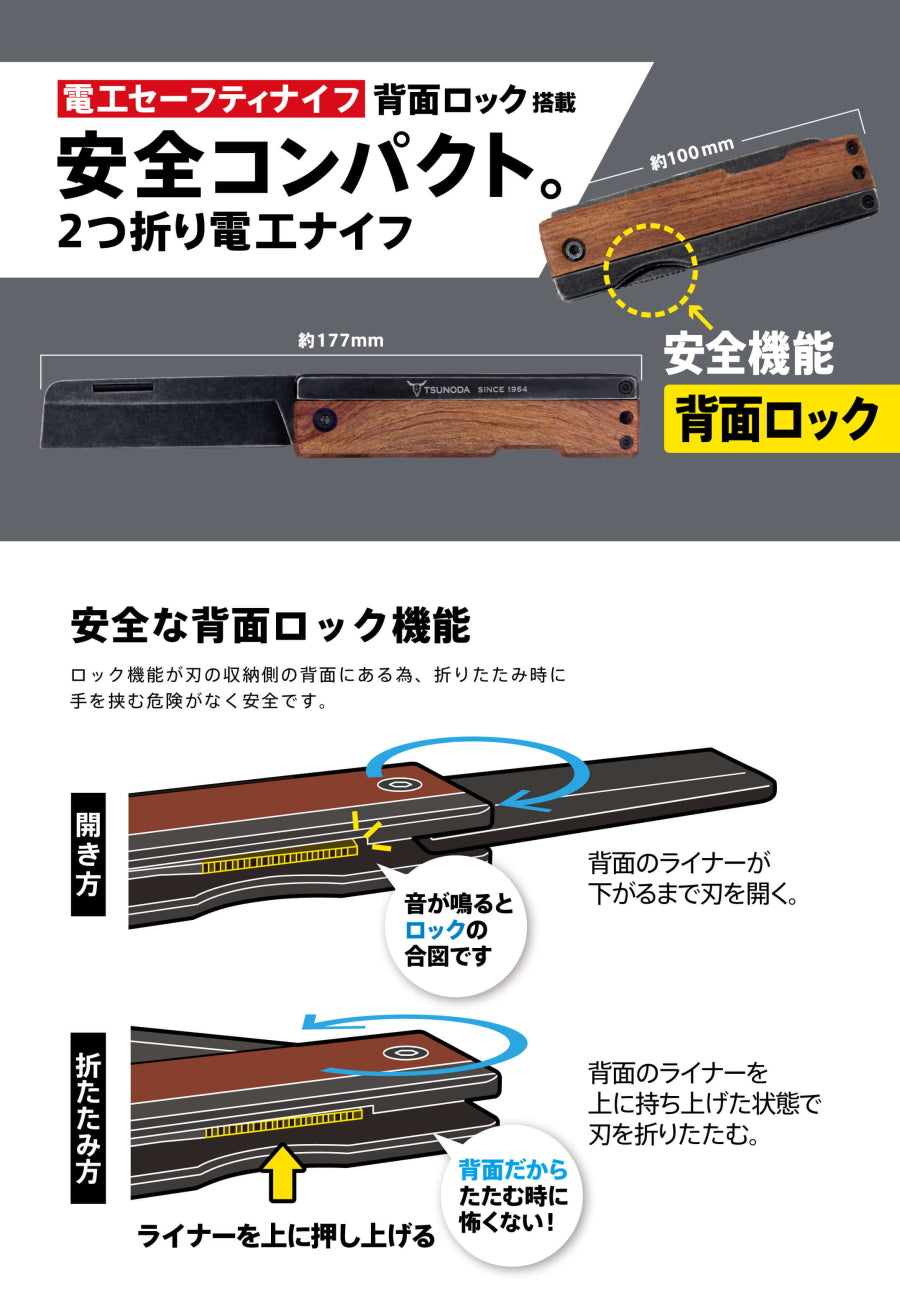 ・安全な背面ロック機能を搭載した、2つ折り電工ナイフ。