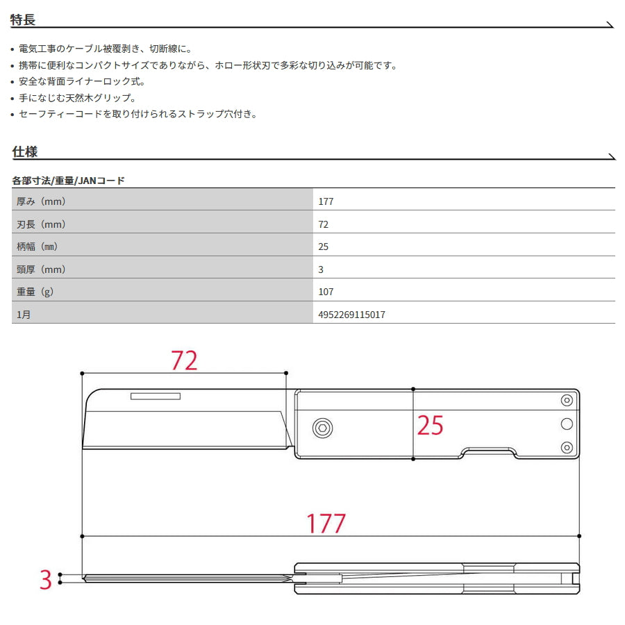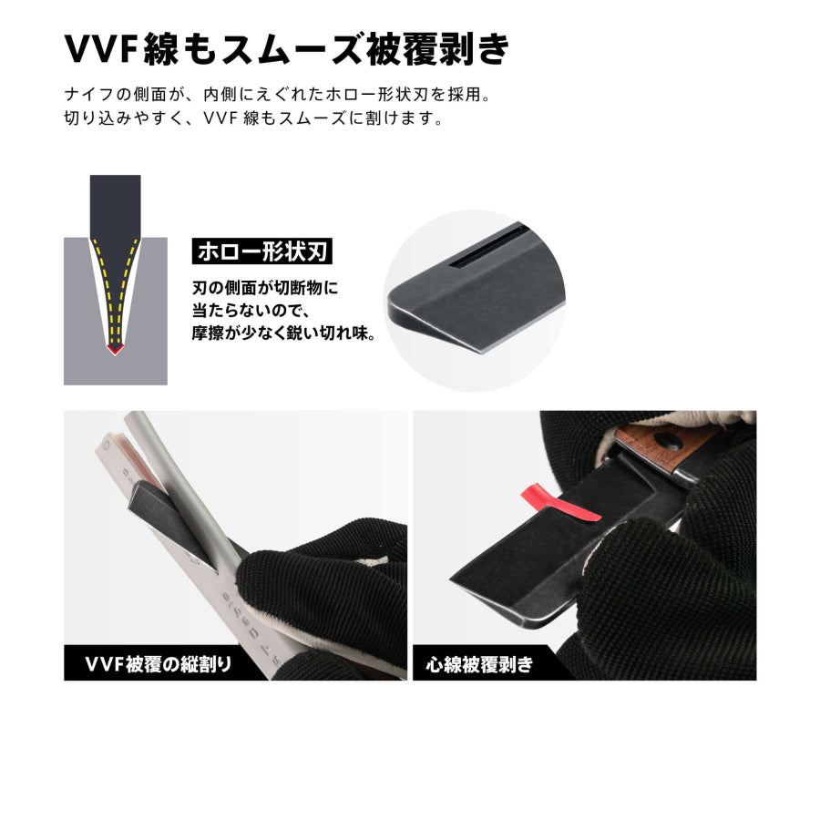 ・ホロー形状刃を採用。多彩な切り込み方が可能で、VVF線もスムーズに割ける。