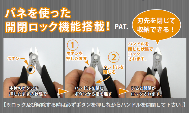 ・バネを使った開閉ロック機構搭載。刃先を閉じた状態で安全に収納できる!(PAT.)