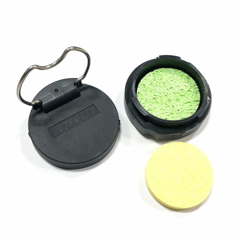 フタの開閉はスライドロック式です。クリーナースポンジは密度の異なる2つのスポンジHが入っています。